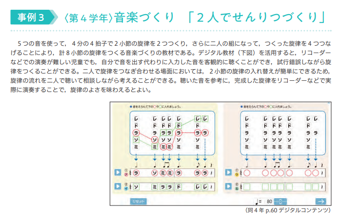 事例3 4年生 音楽づくり ふたりでせんりつづくり。→デジタルコンテンツ