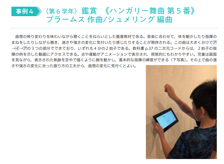 事例4 6年生 鑑賞 『ハンガリー舞曲第5番』→デジタルコンテンツ→紙の教科書のQRコード