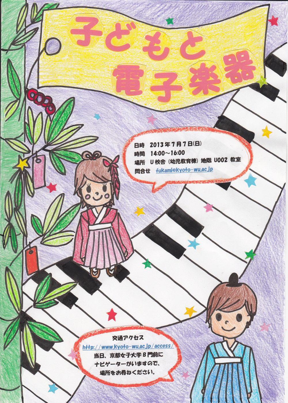 2013年7月7日(日)14時〜16時、幼児教育棟(U校舎)にて児童学科前期講座「子どもと電子楽器」を開催。ドラマーが叩き出すビート、サンプラーパッドから発せられる様々な音よる身体遊び、世界各国の様々な打楽器の音色体験、「七夕」アレンジバトルなど、子どもたちにも大人の方々にも楽しめる内容になっています。先着70名。要予約。 [終了しました]