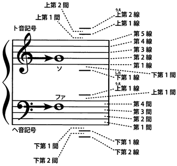 ト音記号の楽譜を高音部譜表、へ音記号の楽譜を低音部譜表とよび、 2つの楽譜をつないだものを大譜表といいます。では次に「卜」や「へ」の「音名」について学びましょう。